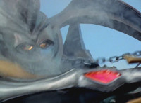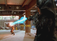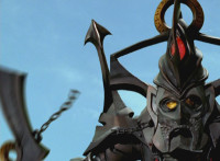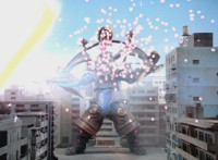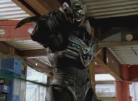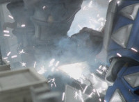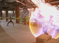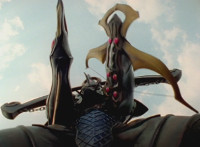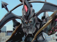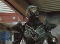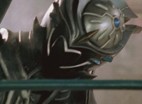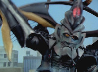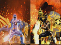 Black whips out his Brachio Staff and faces Zeltrax, as the pair shift to sides. Both then charge at each other, sparkily slashing blades a few times until Black lands a few strikes upon Zeltrax, then leaps up and kicks him away with both feet. Zeltrax falls, rolls, recovers, and fires bluish electricity at Black, which bursts him, but he then rushes past the smoke, leaps up and runs his feet up Zeltrax's chest, before kicking off of him, flipping over and Staff slashing him with energy effects. Black lands, motions Brachio Staff in front of a full moon briefly, creating an energy bubble. Zeltrax reacts, Black speaks, then flings the bubble forth at Zeltrax, causing him to spark burst and collapse to the ground. |