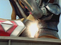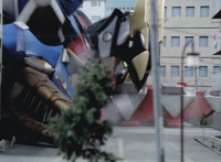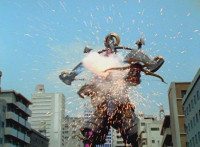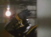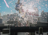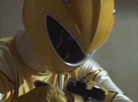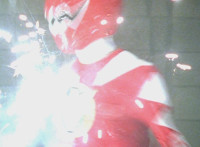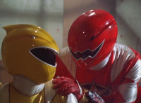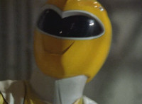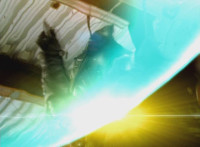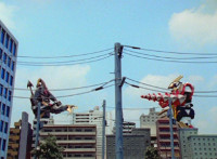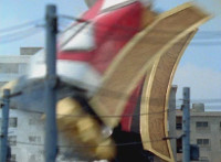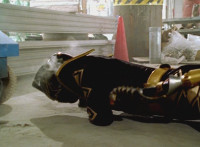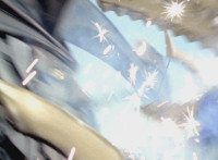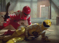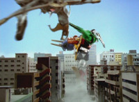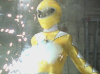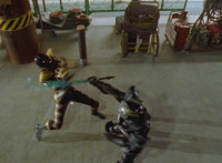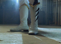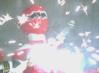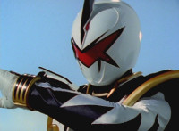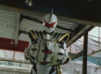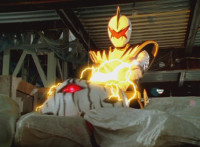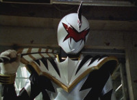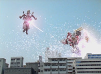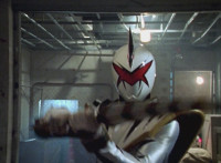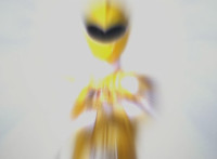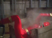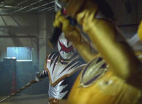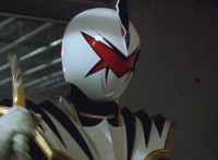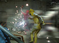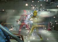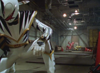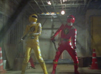 Red speaks to Yellow, who replies quickly, before both rush forth. White's feet then race forth, as he streaks between Red & Yellow, sparkily striking each as he passes repeatedly. He then corkscrew kicks into both at once, sending the Rangers flying into a fence, knocking it down as they fall. White lands with his back to them, then slowly rises up and turns to face them, Yellow reacting, then Red does as well as he gets up and poses before rushing forth. |