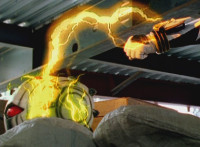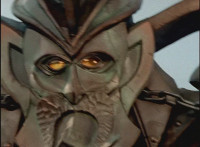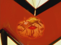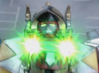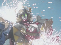 Angor and Thundersaurus march forth and clash arms sparkily, until they lock arms and struggle. They then switch positions, Thundersaurus kicks Angor sparkily away, then the Megazord fires a green forehead energy burst at the monster, sparkily hitting Angor in the chest. |