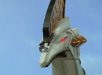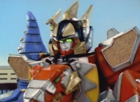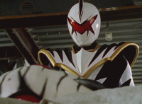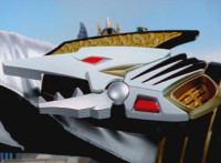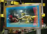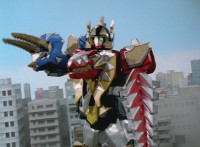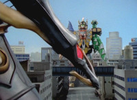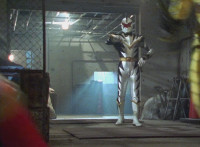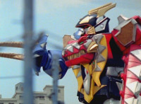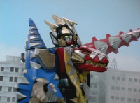 Thundersaurus faces White Dragozord across the city, White then looks to his Morpher, it speaks briefly, before shot zooms in on the Megazord. Each Ranger reacts, then White, in close-up, talks, before shot zooms into the redness of his visor. |