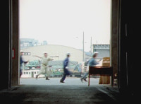 Pan down onto Japanese dockworkers fleeing on foot. Must be quittin' time! Some also race down stairs, and down an alley. |