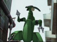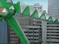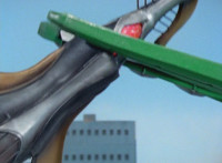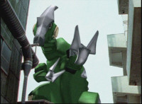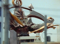 Thundersaurus Megazord jabs its Parasaur clipper arm forth, clamping on Angor's right arm with a blink and a burst, causing the tip of his arm weapon to break off. The Megazord them clamps the clipper upon Angor's waist, lifting him up and flinging him across the city, where he falls roughly. |