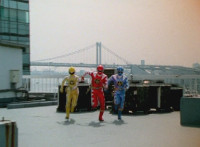 Zoom in on the three Rangers as they race forth on a rooftop, close on Red's feet racing up and leaping. |
