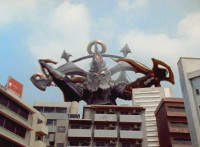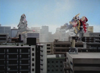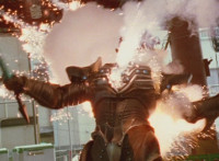 Giant Angor marches into the city, quaking the streets, before stopping and gesturing arms. |
