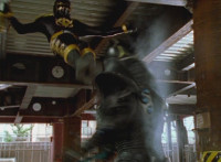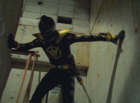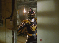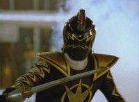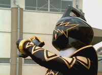 Black shields his head as the building begins to collapse around him, he then flees as the shadow of the new Dinozord grows in the room. |