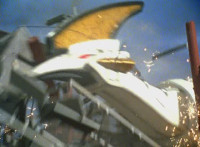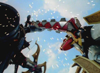 White Dragozord smashes through the upper floors of the construction site building. Thundersaurus Megazord watches, as White Dragozord spreads its wings atop the site. Black reacts, the Drago shrieks, the Megazord reacts, as does each Ranger, the trio then staring forth, before zoom in on Red, as White leaps atop his Zord's nose. |
