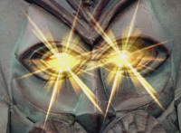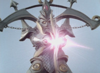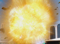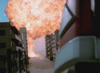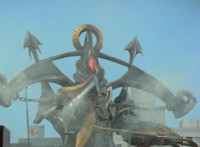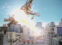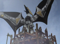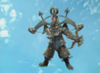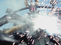 Angor blocks the yellow energy 'rangs, then leaps up into the sky, the Megazord looking up, as the monster floats in the air and puts his arms together, firing energy arrows down upon Thundersaurus, shaking up the cockpit, as more arrows fly down sparkily, bursting the Megazord and all around it, until it topples over. Angor then leaps down and lands on the Megazord's back, jumping up and down with sparkle results as the Rangers suffer within. |