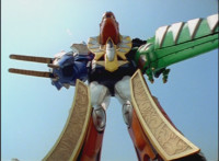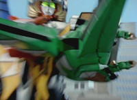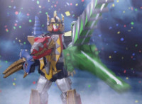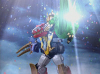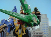 Thundersaurus Megazord charges up the Pterarang before tossing it forth. |