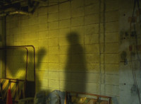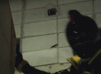 Black reaches some boxes, looks around, then turns sharply to see something to our left. |