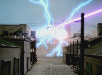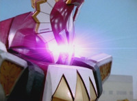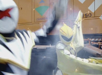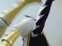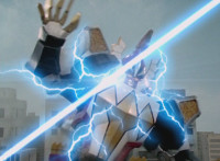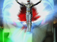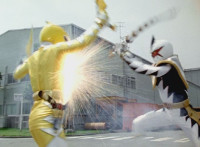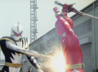 Red leaps up and slashes his Thundermax Saber forth, only to get it clashed by White's Drago Sword, who then sparkily slashes Red a few times, before doing the same to Blue, then Yellow. White then presses his blade to Yellow and pushes her, off her feet, backward. |