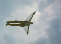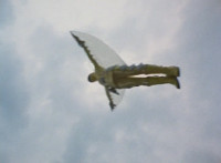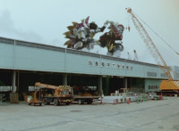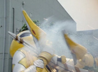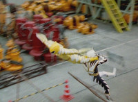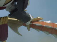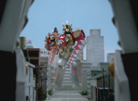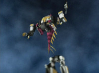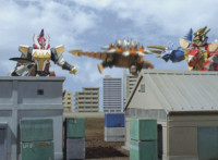 White Dragozord shrieks, Stegozord roars, as both fly up into the sky and transform into component body parts. Dino Stegazord comes together, then poses completed in midair. |