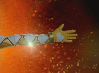 Altered to fit viewscreen; cuts before it steps forth. |