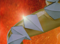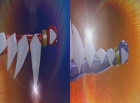 Ankylozord springs to life and walks in front of a cloudy blue sky, before raising his tail and firing a projectile from it as Dino Stegazord, burstingly. |