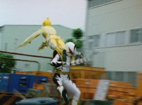 Yellow breaks out of White's hold and slashes him down with her Super Dino Mode wings. He falls, rolls, and recovers. |