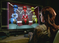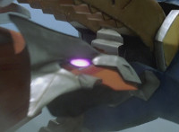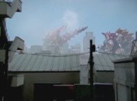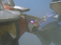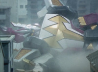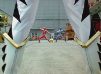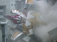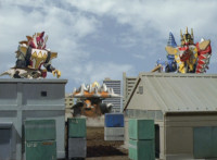 White speaks in his cockpit, before Dino Stegazord poses fiercely in the city, then begins to move. Zoom in on Red as he speaks, Thundersaurus then rushing into action. Dino Stegazord grabs Ankylozord's tail, while the Megazord grabs his head. The two struggle in a tug-of-war with Ankylozord between them. Ankylozord drills his tail sparkily into Dino Stegazord's hand, and chomps sparkily on Thundersaurus' Tricera hand, soon released from both at once. Both Megazords collapse to the ground, White speaking as he gets Dino Stegazord back up first. |
