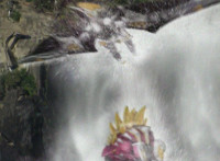 White Dragozord and Stegozord come out from hiding inside of a waterfall. White then poses and leaps up. |