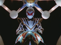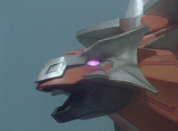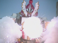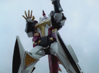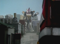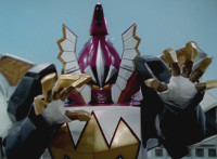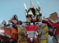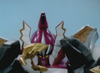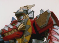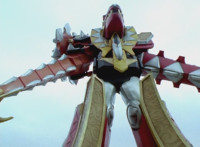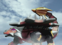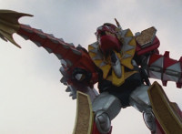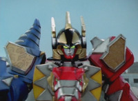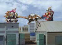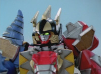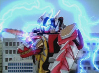 Tyrannozord transforms into the body, Tricerazord into the right arm, the head pops out, then the body leaps up and Pterazord locks on, before the helmet locks onto the head. The three cockpits merge into one, as Thundersaurus Megazord floats completed in front of an explosion. |