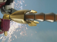Thundersaurus recovers, zoom in on Red speaking. Ankylozord waddles over and leaps up onto Thundersaurus Megazord, forming its new right arm. The Rangers speak, as the Megazord poses with its new arm, Dino Stegazord reacting, White responding, then firing Dino Stegazord's eyebeams, which bounce off the Ankylo shoulder, reflecting back at Dino Stegazord explosively, jolting White. Thundersaurus Megazord charges past Dino Stegazord, sparkily striking it with its tail arms. The Rangers speaks and gesture arms, causing the Megazord to raise and charge up its tail arms, slashing both forth at Dino Stegazord, causing it to crackle. Thundersaurus then charges up its Ankylo arm once more and jabs it forth, striking Dino Stegazord so hard it flies across the city and falls to the ground, leaving the Megazord posing victoriously. |