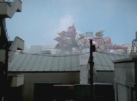 Dino Stegazord poses fiercely in the city. |