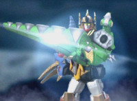 Brachiozord opens up his compartments, revealing the main three Dinozords inside. Tyrannozord races out of the side compartment. Pterazord flies out of the front compartment, and Tricerazord marches down Brachiozord's neck. |