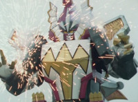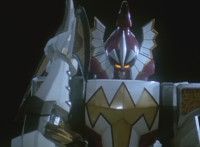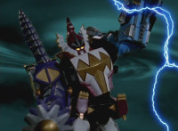 Thundersaurus Megazord lands facing the newly armed Dino Stegazord, posing battle ready, Red making a fist in zoom-in. White stands steady, as Dino Stegazord punches its Cephala arm forth repeatedly, sparking and crackling the Megazord and its cockpit. |