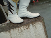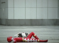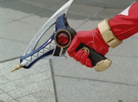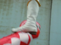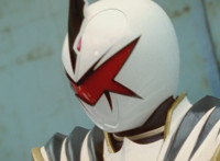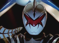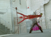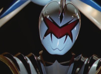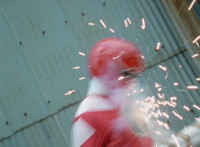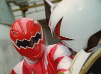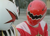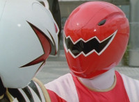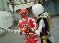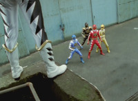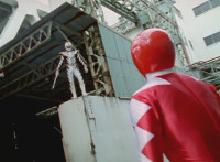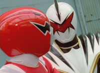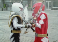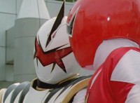 White dashes through the four Rangers, bursting them with his sword, Red the last, falling and rolling to the side, where White dashes in and slashes, Red ducks, jumps, kicks, blocks, and then they end up arm locked again. The pair talk up close for a moment or so. |
