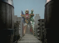 Each Ranger leaps up and merges into the forehead of their respective Dinozord. |