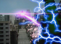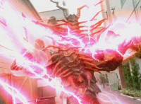 Insectolite unleashes pink electricity, which bursts the Rangers off their feet. Black turns and talks forth on the ground. |