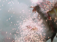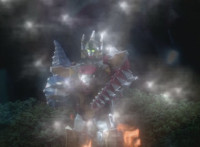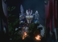 Zoom in on Dino Stegazord standing before the flames, as it begins to teleport away in sparkles. Inside the cockpit, White speaks a little. Dino Stegazord teleports away, leaving Thundersaurus Megazord uneasily shifting. |
