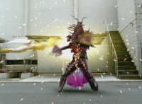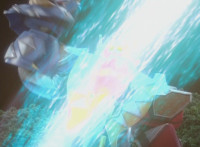 Blue punches his Tricera Shield forth. Insectolite crackles while being impaled on the edge of the shield, suddenly losing traction as he's lifted into the air and spun around on the shield horn, until he goes flying off and slamming into the wall. |