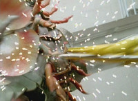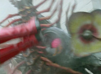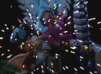 Dino Stegazord has its Stinger weapon float down and hover in front of it, charging it up before sending it flying right at Insectolite, bursting him with a superimposed explosion. He then falls over. |
