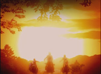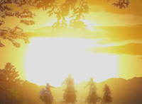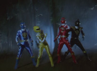 The three Dino Rangers on their Raptor Riders and Black on his Dino ATV ride away from the setting sun into the forest. |