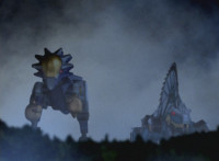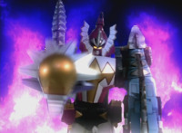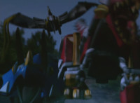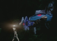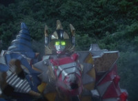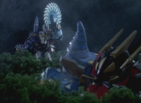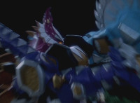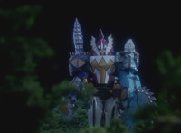 White walks away from Dimetro and Cephala, his White Drago Sword glowing briefly, before the pair of Zords explode suddenly! Red parks his Raptor Rider and joins his teammates in stumbling over in shock to see the spot where the Zords were now a smoking void. Yellow speaks, pan over to Black, also saying something. Slowly, from the smoke come Dimetrozord and Cephalazord! Blue reacts, as does Red, when the ground quakes around the Rangers briefly. Dino Stegazord approaches from nearby. |