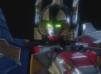 Red talks upward, pan over to Black doing the same. Dino Stegazord looks at each arm. Yellow speaks, pan over to Blue doing so also with a fist clenching. White talks in cockpit with a slow zoom-in. |
