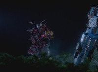 Dino Stegazord raises its Dimetro blade arm up, from various angles, when Insectolite's arm swoops in and bashes it sparkily on the back, jostling White within. Dino Stegazord turns around to see the giant monster, talking and taunting. |