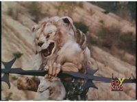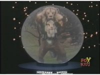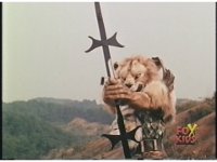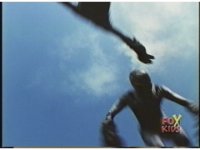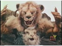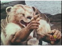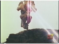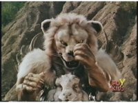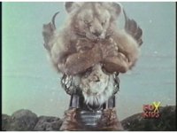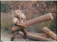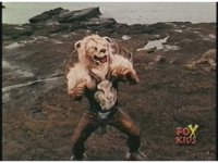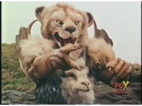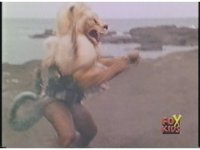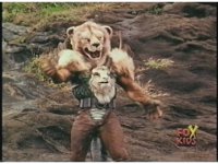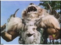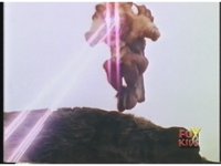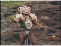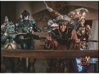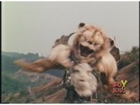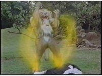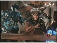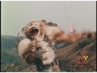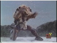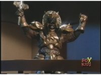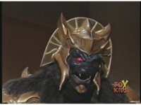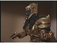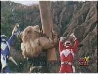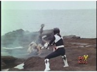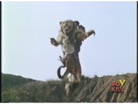 Goatan gets sparkily slashed by Black Ranger's Power Axe, zoom out as the monster falls, then gets up and stumbles about while Black remains in same position whole time. |