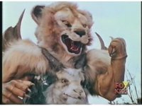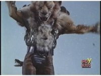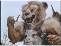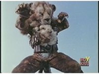 Zoom in after Goatan crosses arms then spreads them out, chest-mounted goat face opening mouth in close up. |
