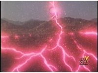 Megazord motions sword, pulsing with lightning and electricity, powering it up while raising it to the snowy sky, which surge with a reddish storm. |