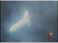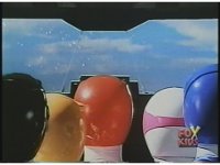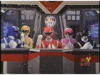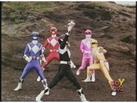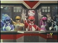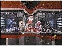 Zoom out from Red, as all five Rangers in cockpit raise right arms and make slashing downward motion. |