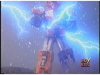 Horns fold out, eyes glow, bright flash occurs, then sharp zoom to Megazord posing fully formed amid lightning. |