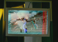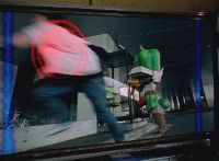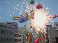 Altered to fit monitor; cuts follow-ups of him blowing it up. |