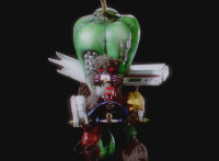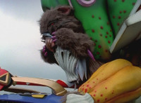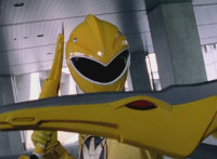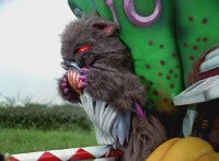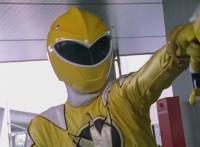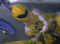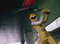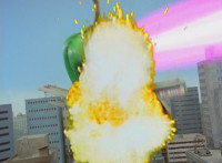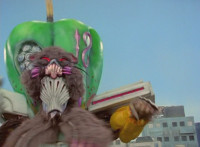 Copyotter spins and readies a red pepper, then pitches it forth, Yellow bats it back with her Thundermax Saber, it hits the monster and superimposed explodes. Yellow taunts as her teammates regroup around her. |