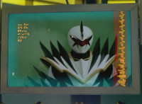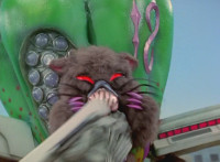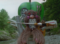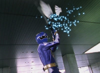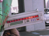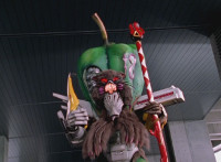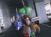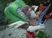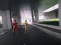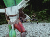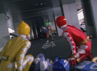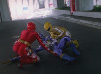 Red & Yellow regroup around the downed Blue, and watch as Copyotter talks. Red & Yellow pull out their weapons, so Copyotter copies them, making his own Tyranno Staff and Ptera Grip. The Rangers react, the monster scrapes his foot on the floor, then dashes forth and sparkily strikes the pair with their respective weapon. They fall, Blue comforting them, Yellow looks up, as Copyotter's scanner arm and shoulder machine light up and he talks. Yellow, Blue, then Red speak quickly, Copyotter patting his fist on his palm, then turning and exiting as the Rangers recover and discuss, before rushing off after him. |