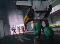 Each Ranger leaps up and merges into the forehead of their respective Dinozord. |