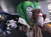 Copyotter spins around, as Super Dino Mode White flies at him and readies arm blades. |