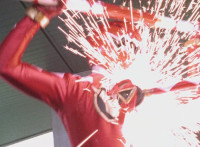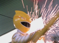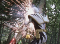Cuts follow-ups of Megazord & monster clashing arm blades, then the Megazord kicking him sparkily away. |