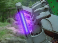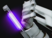 Copyotter activates his scanner arm, creating his own Tricera Shield. Blue reacts, Copyotter fires a laser from it, bursting Blue. |
