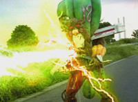 Struck by his own beams, Copyotter erupts with a superimposed explosion. |