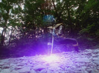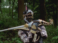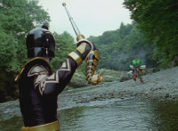 Copyotter prepares to fire on the Rangers with the Z-Rex Blaster, when he turns suddenly, as Black makes the scene. The monster reacts, Black readies his Brachio Staff, charges it up and hits the ground, sending a blast of dust at Copyotter, spark bursting him. Black then rushes over to his teammates in the riverbed, and guards them. Copyotter copies his Brachio Staff, charges it up, then hits the ground, causing the water around the four to burst up around them. |