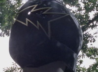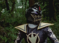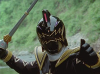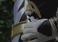 The Rangers react, zoom in on Black summomning into his Morpher. |